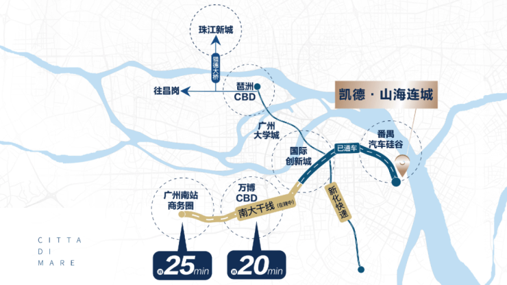 凯德·山海连城坐落于广州番禺莲花湾,地理位置优越,交通便捷。作为湾区的重要交通枢纽,项目周边有莲花站,集3条城轨和2条地铁于一身。