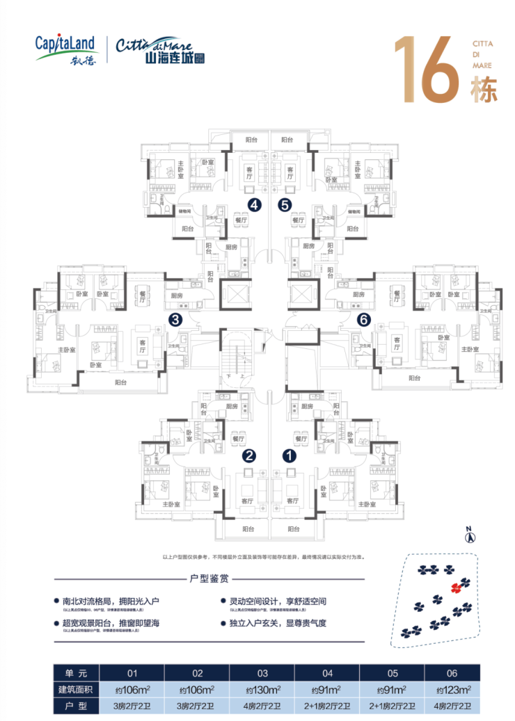 项目现正热售16栋一线海景小高层,包括91平方米的三房、106平方米的三房以及124-130平方米的四房户型。