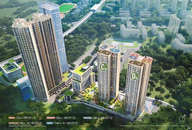 言成云祥公馆二期建筑面积约6.7万平方米,规划包括2栋高层住宅、1栋12层办公建筑以及1栋3层高的商业建筑。二期房源面积确定为72-140平方米,涵盖2-4房户型,其中72平方米的两房、86-88平方米的三房、99平方米的三加一房以及140平方米的4+1房,满足不同家庭的居住需求。