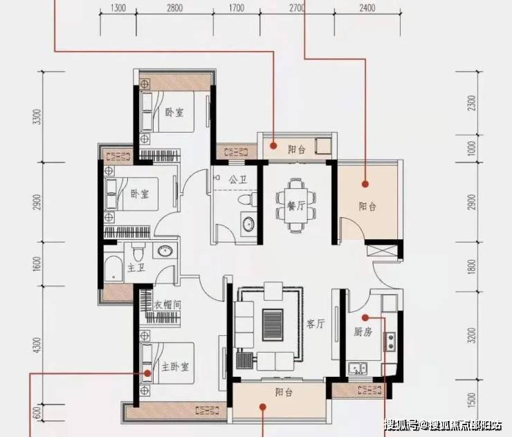 A户型:约117㎡ 4房2厅2卫 亮点:餐客厅双阳台 奢阔主卧