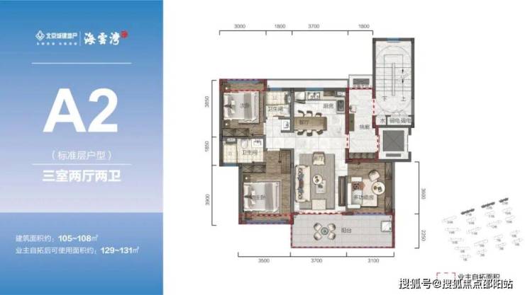 ⭕标准洋房产品(A1、A2):105-117㎡演绎大面宽短进深的经典格局 三室两厅悦享方正宜居,品鉴自贸港粹美生活