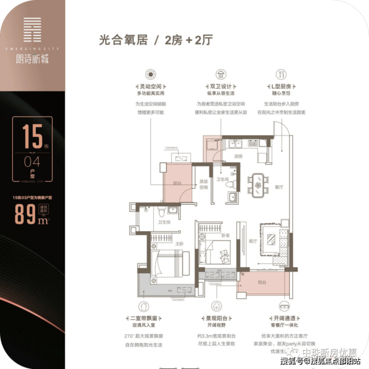 ③建面约89㎡三房两厅两卫,高实用率,动静分区,阔景主卧全赠送飘窗。