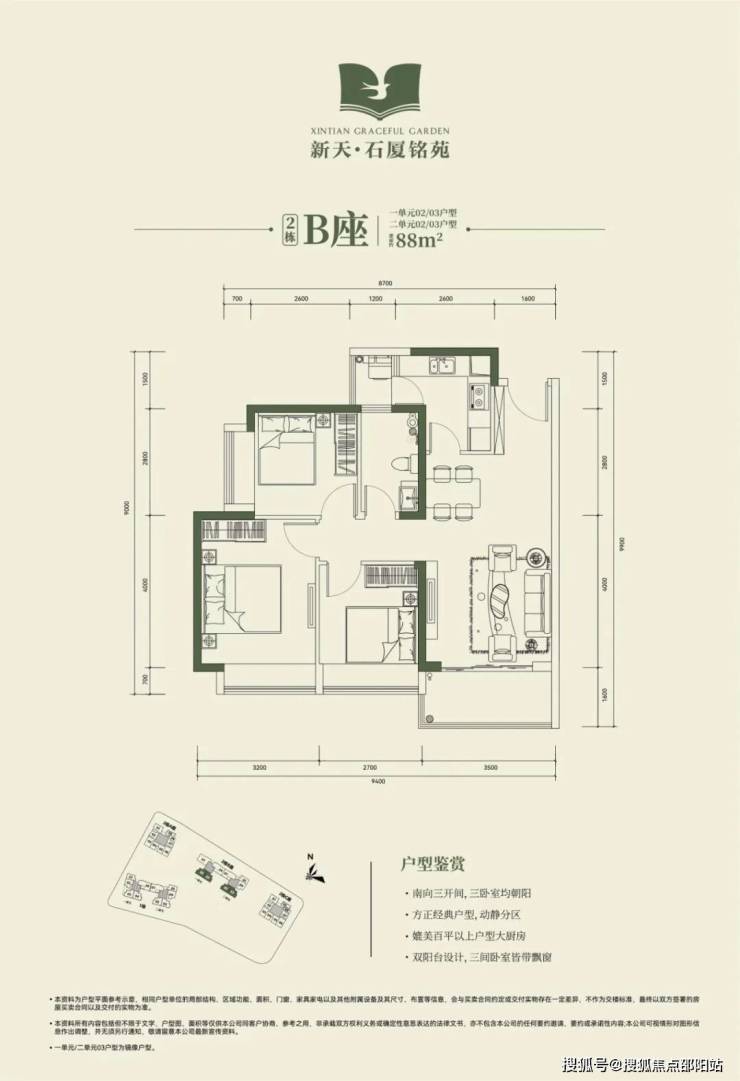 2栋B座一单元的02和03户型以及二单元的02和03户型均为三室两厅两卫,面积约为88平方米。