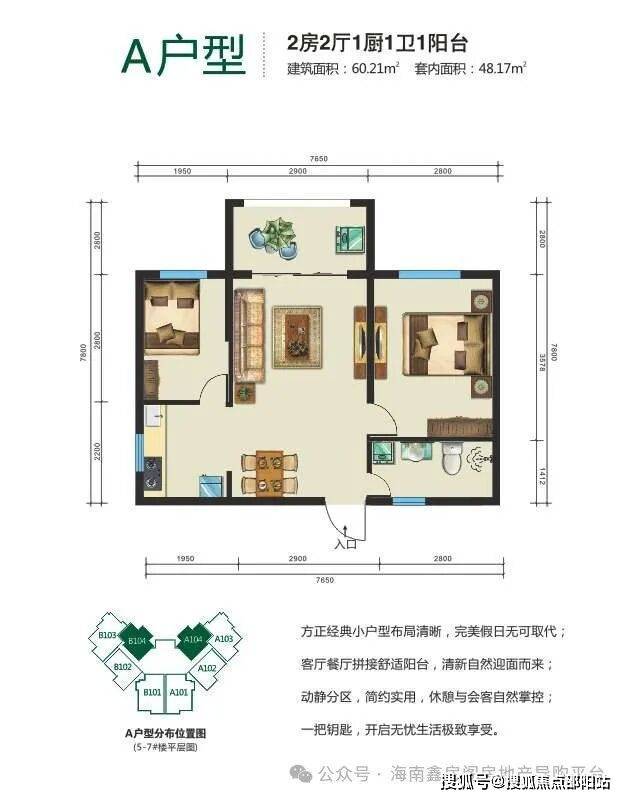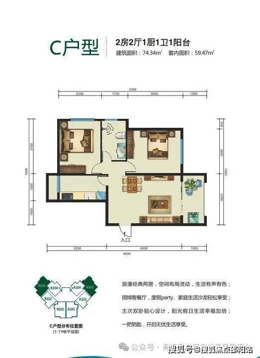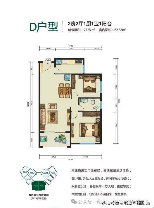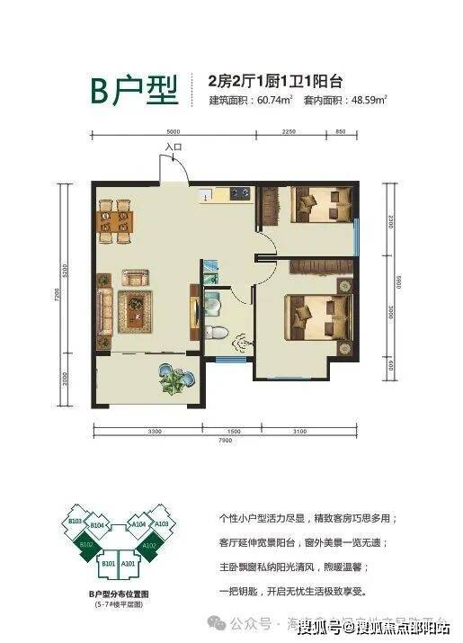 :主力户型:53.47平一房一厅、60.22平二房二厅,73.06、77.98平二房二厅