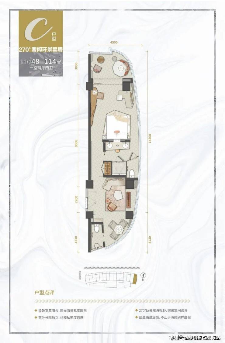 项目占地面积约10万㎡,总建筑面积约30万㎡,整体容积率约为2.5;项目总房源约3377户(其中当期开发413户),车位约2355个。项目目前在售的户型,主要为建面约43-96㎡的海景公寓。项目首批产品于2019年9月入市销售,目前3#栋公寓在售,均价2.2万元/㎡。