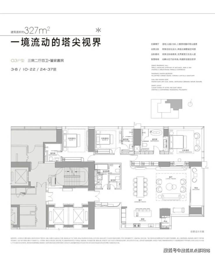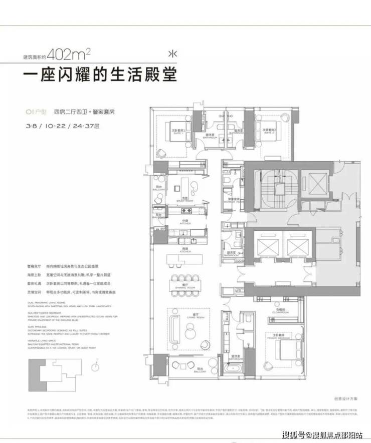 业态组成:4栋51-63层公寓(层高3.6-3.9米,含388米地标主塔T1)、2栋高层办公楼、19套独栋董事公馆、16套合院别墅及约1.4万㎡高端定制商业