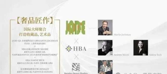 全球顶级建筑设计机构:JADE&QA(上海世茂深坑酒店、迪拜的 Jumeira Beach Hotel)全球顶级室内设计机构:HBA设计(苏州莱佛士酒店、成都费尔蒙酒店、河内洲际酒店、印尼洲际酒店等超是个五星级酒店设计)
