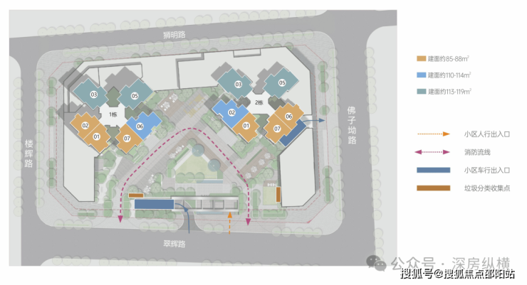 【产品户型】:建筑面积约85-88m²三房两卫、建筑面积约110-114m²四房两卫、建筑面积约113-119㎡四房两卫