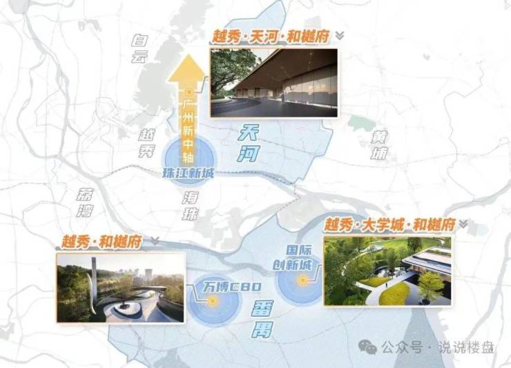 从番禺·和樾府、大学城和樾府,我们不难看到,和樾府这个IP有三大共性: 首先是核心地段。