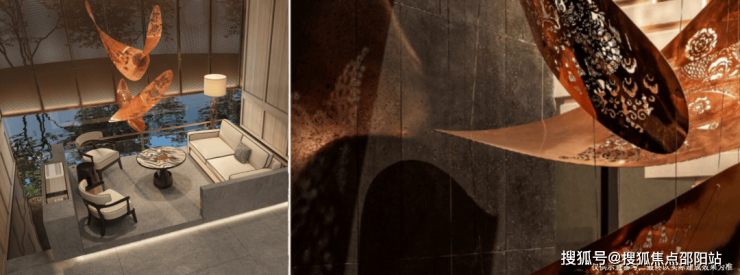 比如,金属帘幔上的团,源自罗行竹编的肌理;庭院里的石雕,有着英石的风骨;甚至是一盏入户灯,都让人联想到大良鱼灯的韵味...