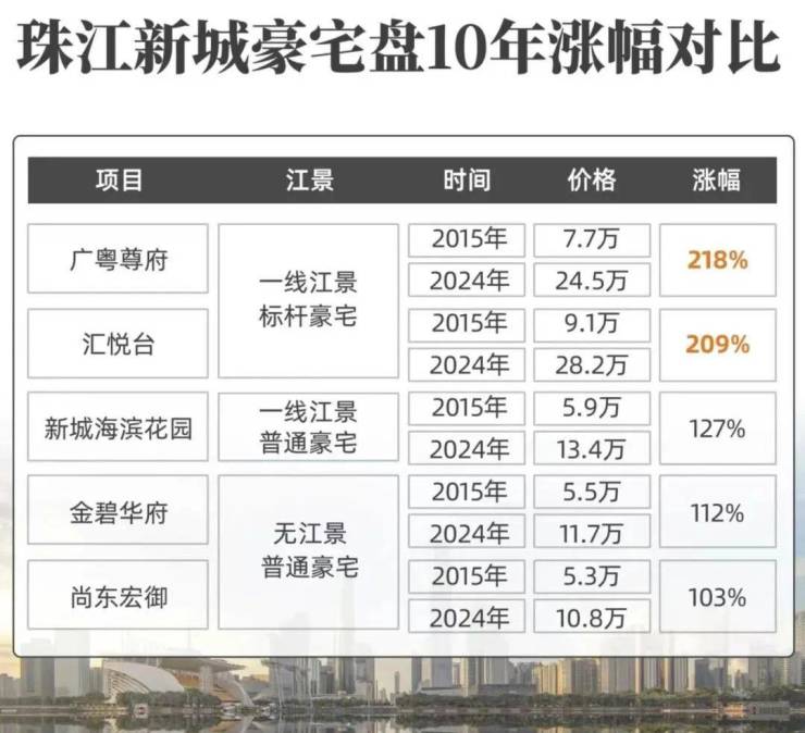 像同在珠江新城东区,占据一线江景的标杆顶豪盘,不仅总价更高,涨幅也远远甩开其它没有江景或者品质一般的豪宅盘。