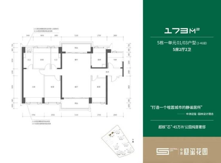【五栋一单元-平面图】3梯3户,3条腿,分别是01、03号房户型约173㎡的5房2厅2卫、02号房户型约149㎡的5房2厅2卫