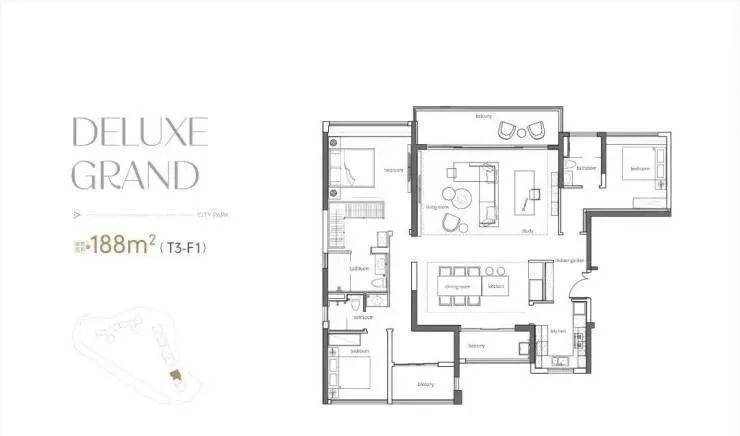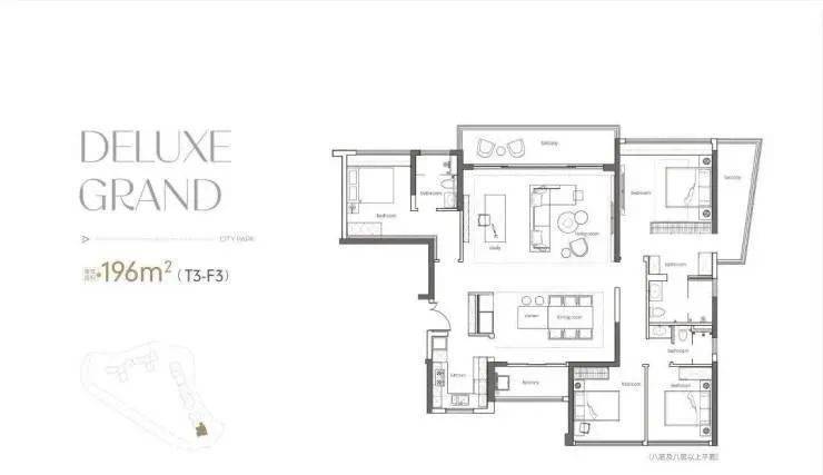 190方户型,四房两厅三卫双套房,T2组合、7米大阳台、9米阔卓厅堂、近55方餐厅,诠释了功能与奢适完美相融