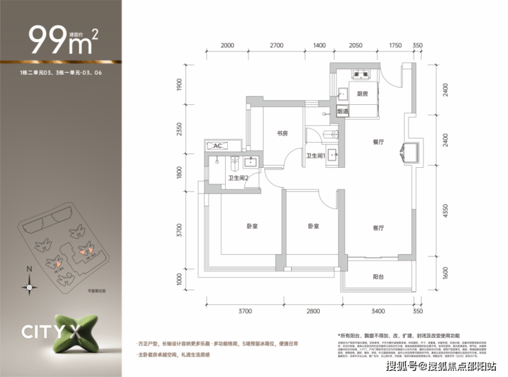 建筑面积约99㎡的3房2卫02/03/05/06户型:全南向爆款空间