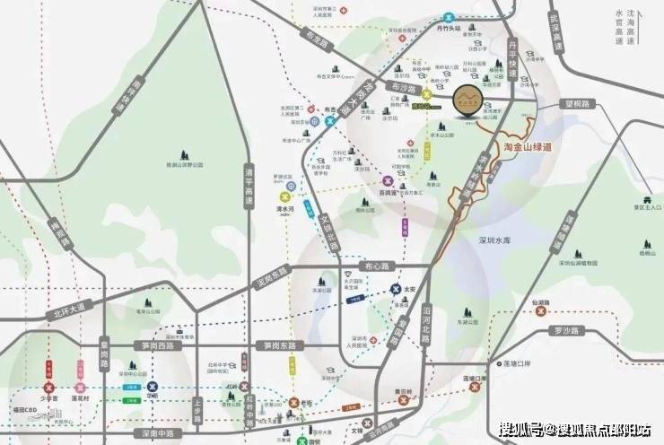 约200米直线距离到淘金山绿道,沿线共13个景观节点,起于翠湖社区公园,终至沙湾路,分为映彩华章、山林野趣、山湖叠翠和绿廊揽胜四个主题段,可俯揽深圳水库、远眺梧桐山。近邻求水山公园、樟树布公园,举步自然的浓荫谧静,成为家人休闲栖息目的地。