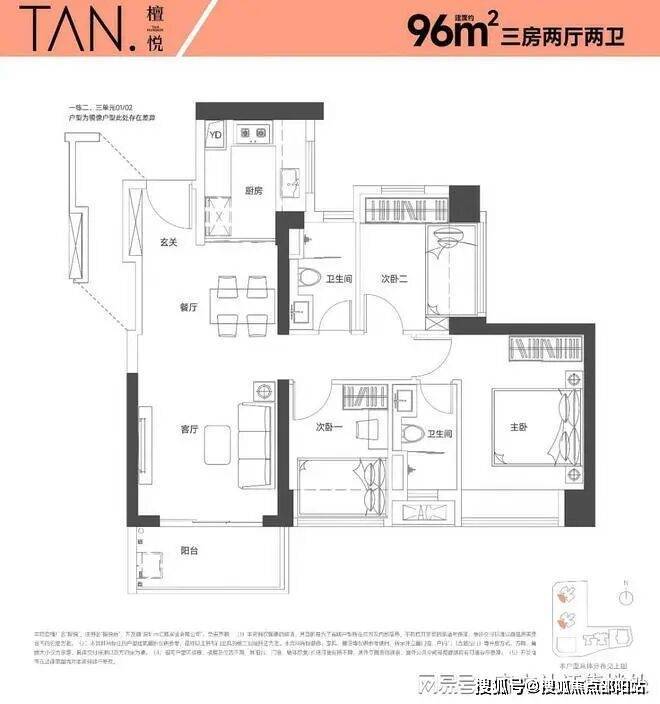 95-96㎡三房两卫(东南/西南朝向):竖厅设计,主卧带独立卫浴和步入式衣帽间,三开间朝南(96㎡户型采光面达10.2米),次卧双飘窗,U型厨房。特点:极简MUJI风,原木色系搭配大面积玻璃,空间通透。双卫生间设计缓解多人口家庭使用压力,东南/西南朝向兼顾采光与通风。适配人群:二孩家庭或三代同堂,注重居住舒适度与功能分区。