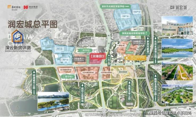润宏城,位于光明区凤凰街道塘尾社区,总占地面积约195万㎡ ,总建筑面积约382万㎡,住宅面积高达172.44万㎡,分多期多地块开发,其中一期就分4个地块开发,前期入市的是润雅园已经基本售罄,还剩少量4房在售,这次润臻园就是1期其中一个地块,后面还有二期三期,另外产业配套也分4期开发打造,还规划有3所九年制学校、2所18班幼儿园,3所12班幼儿园,3所9班幼儿园。