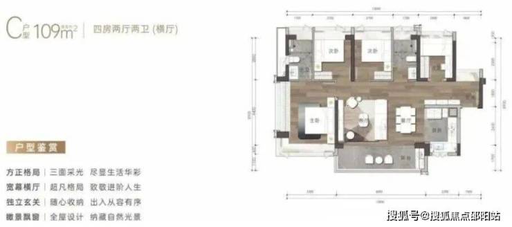 109㎡横厅四房两卫:南北通透格局,客餐厅约6米开间,公卫三段式分离,空间利用率拉满。