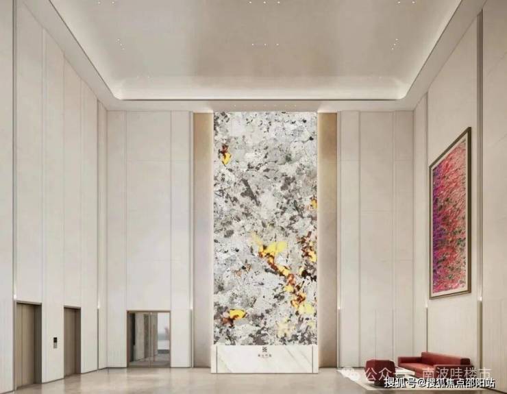 社区主入口的酒店式大堂,是一场材质的和谐对话,石材的温润、通顶玻璃的通透与铝板的利落在此共生。意大利宝格丽奢石接待台的天然脉络,巴西潘多拉透光奢石背景墙的光影流转,与当代艺术家蔡锦的牡丹油画形成视觉共鸣;约9米挑高的弧顶艺术涂料天花,为这场美学盛宴加冕。
