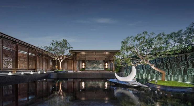 光明唯一沉浸式浮光水院,汉白玉原石打造“心湖之月”+斜飘冬青等;