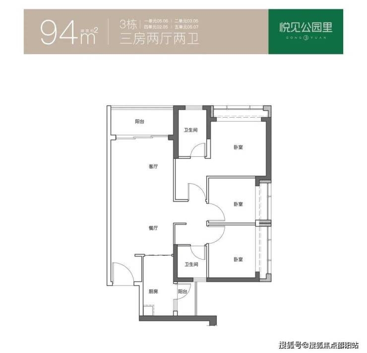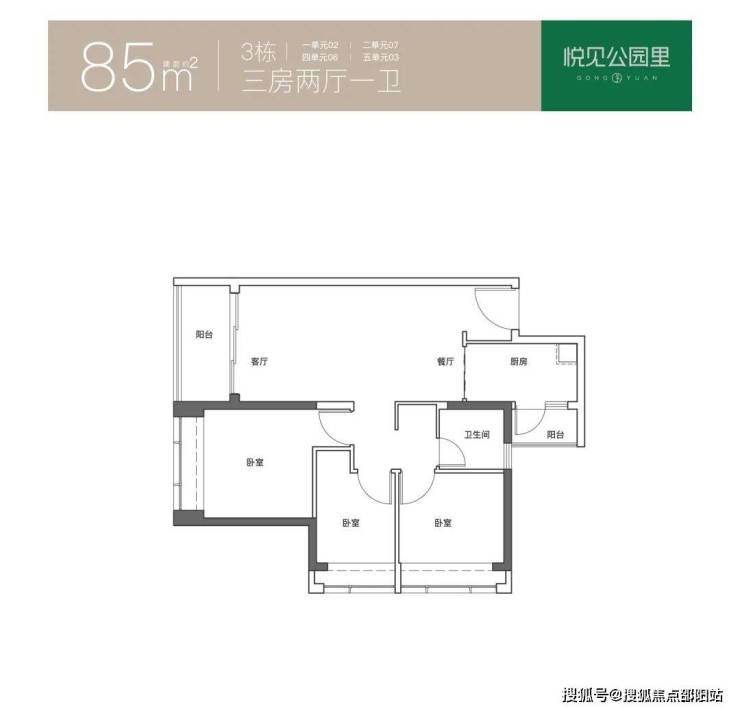 约 85㎡三房:南向双阳台 + U 型厨房,主卧 270° 转角飘窗,采光通风俱佳,空间利用率高。