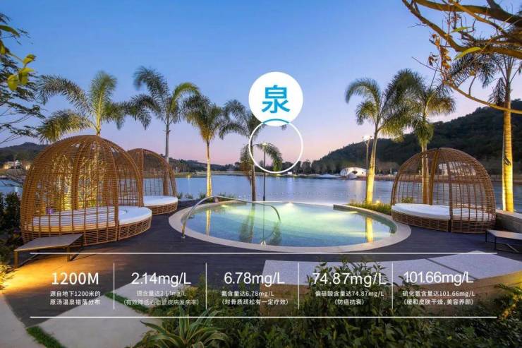 小镇温泉取自地下1200米处天然温泉,出水温度49度。泉质属重碳酸根铁温泉,被养生专家誉为“气血之汤”,媲美日本三大古泉有马温泉“黄金汤”。温泉富含锶、氟、偏硅酸、硫磺,锶对心血管和肠胃消化系统有很好的疗效,氟对骨质疏松和关节炎有很好的疗效,偏硅酸对心血管和皮肤有很好的疗效,硫磺消毒杀菌缓解皮肤干燥,被称之为壮骨汤、美容汤。同时温泉还能防癌抗衰老。
