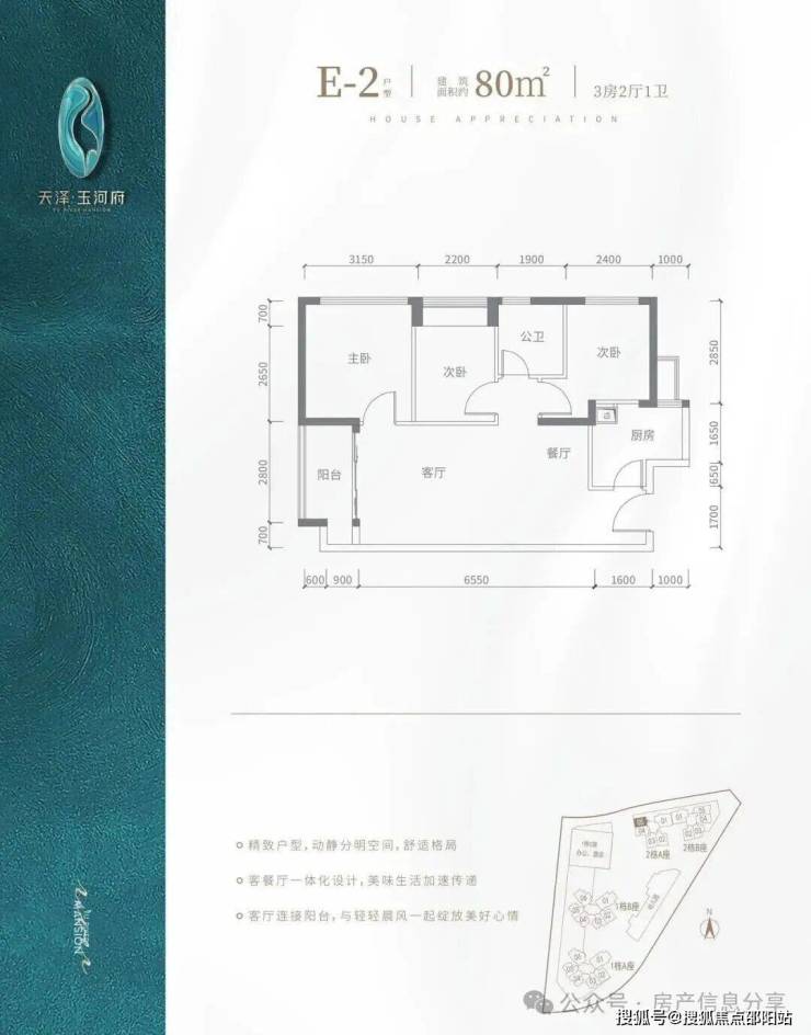 建面约80㎡的户型开间就有约3.5米,格局方正、动静分离、空间开阔、采光充足。基本上达到了市面上90㎡以上户型的尺度。