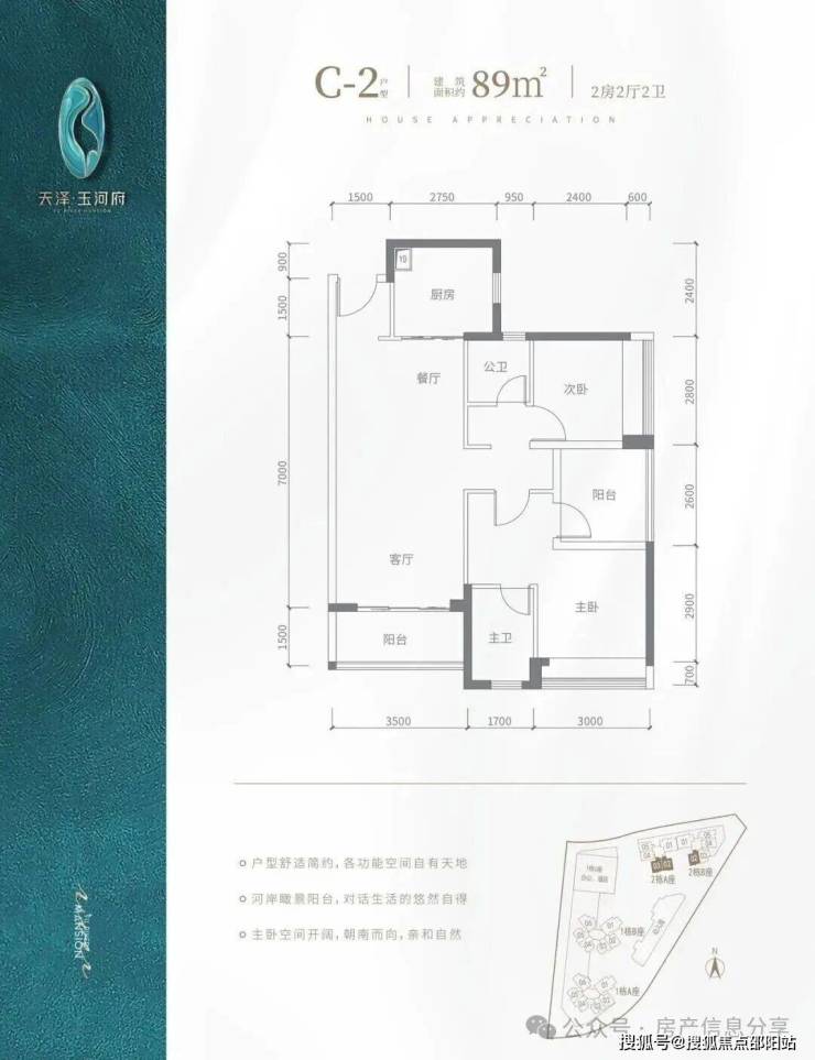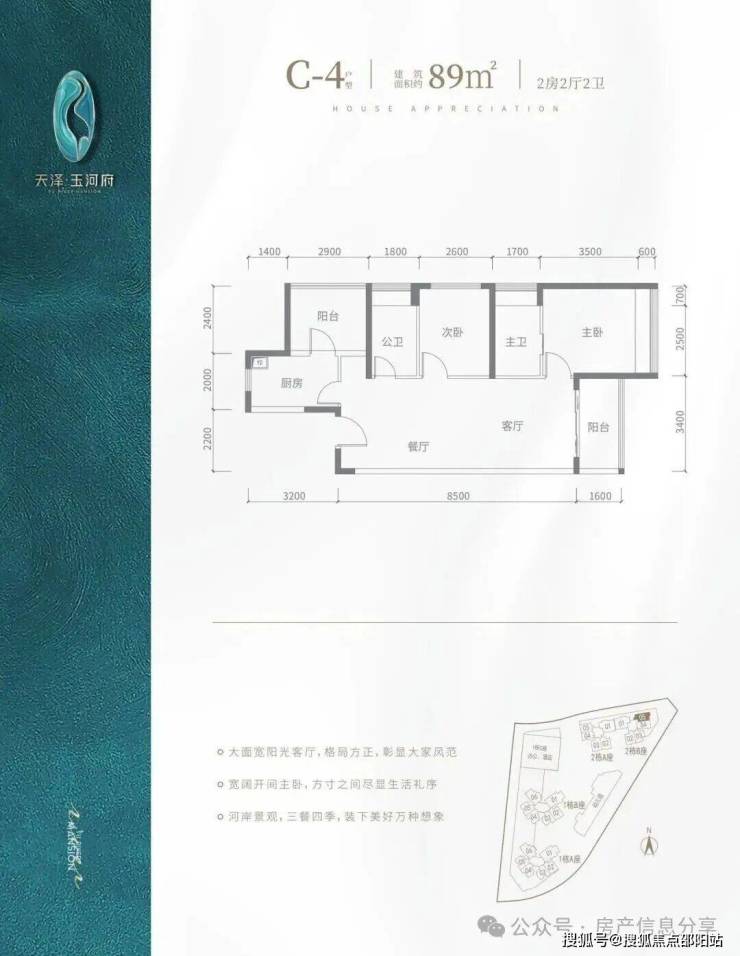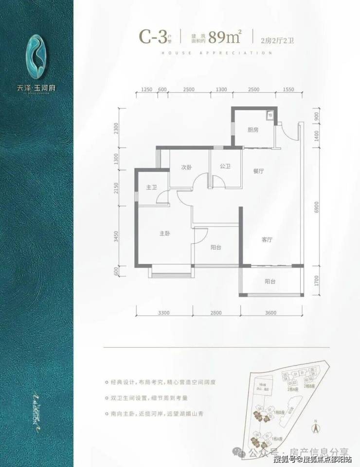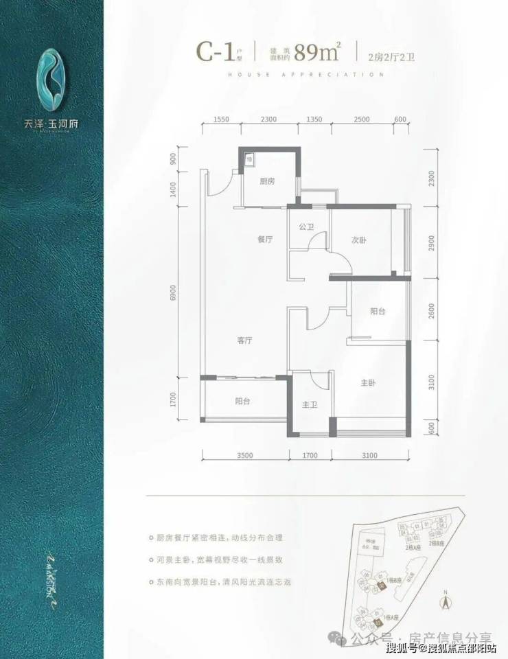 横厅南北通透格局,约6.5米大阳台连接客厅跟次卧,客餐厅开间约7.3米,双套房设计,南面套房开间约3.5米,带一个独立阳台,北面套房开间约3.6米,两个次卧开间约3.1米,约2.6米;阳台东南朝向,看茅洲河景观。
