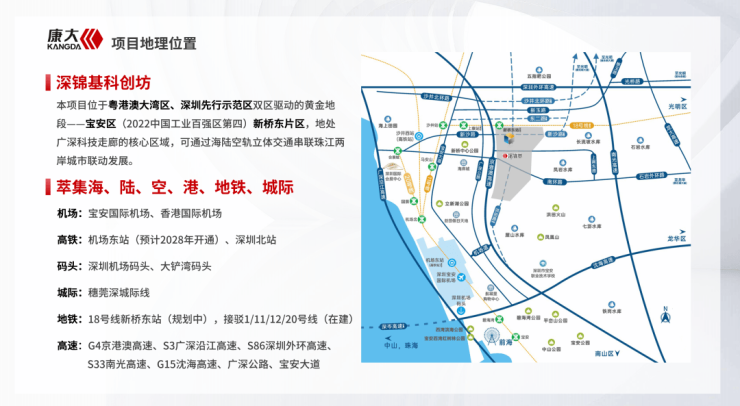 项目位置:本项目位于粤港澳大湾区、深圳先行示范区双区驱动的黄金地段——宝安区(2022中国工业百强区第四)新桥街道东片区,地处广深科技走廊的核心区域,可通过海陆空轨立体交通串联珠江两岸城市联动发展。