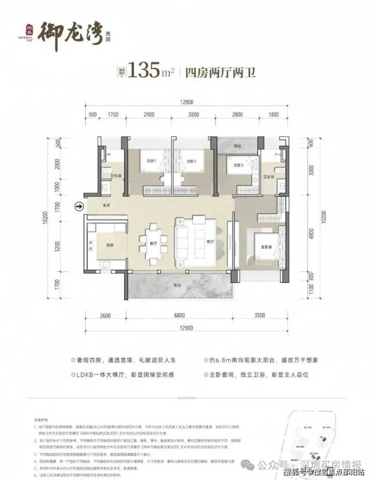 135㎡4房2卫,设计的是横厅南北通透格局,客餐厅开间6.8米,LDKB一体化设计,四开间朝南,U型厨房,公卫三段式分离设计,得房率约79.25%(不含赠送),阳台主朝东南或西南向,加上赠送得房率约90%