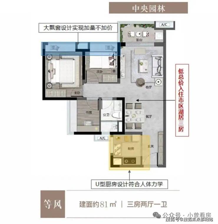 特点:三进式设计提高全屋实用率,270°环幕景观阳台,单边位南北对流采光通风。