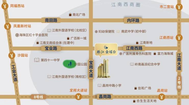 交通便利,距离地铁 8 号线宝岗大道站约 500 米,20 分钟可达珠江新城;距 2 号线江南西站约 800 米,方便抵达广州南站等枢纽。位于宝岗大道,连接海珠区与其他区域,18 分钟自驾可达珠江新城。商业繁华,处于江南西商业区核心,1 公里内有六大商业中心。教育资源方面,有汇源小学,对面是广州市江南外国语学校,周边 2 公里内多所省级名校环伺。