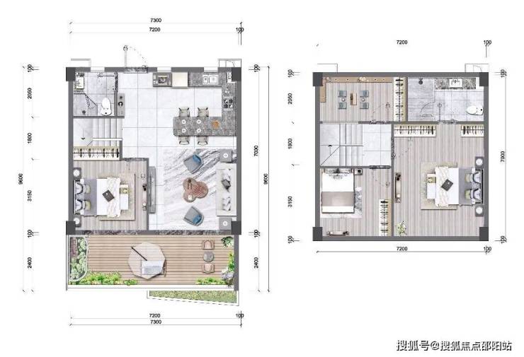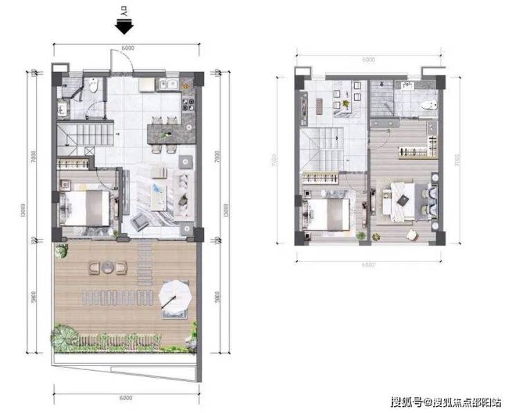1F:客厅及厨房、餐厅、客卧、超大观景露台、干湿分离卫生间