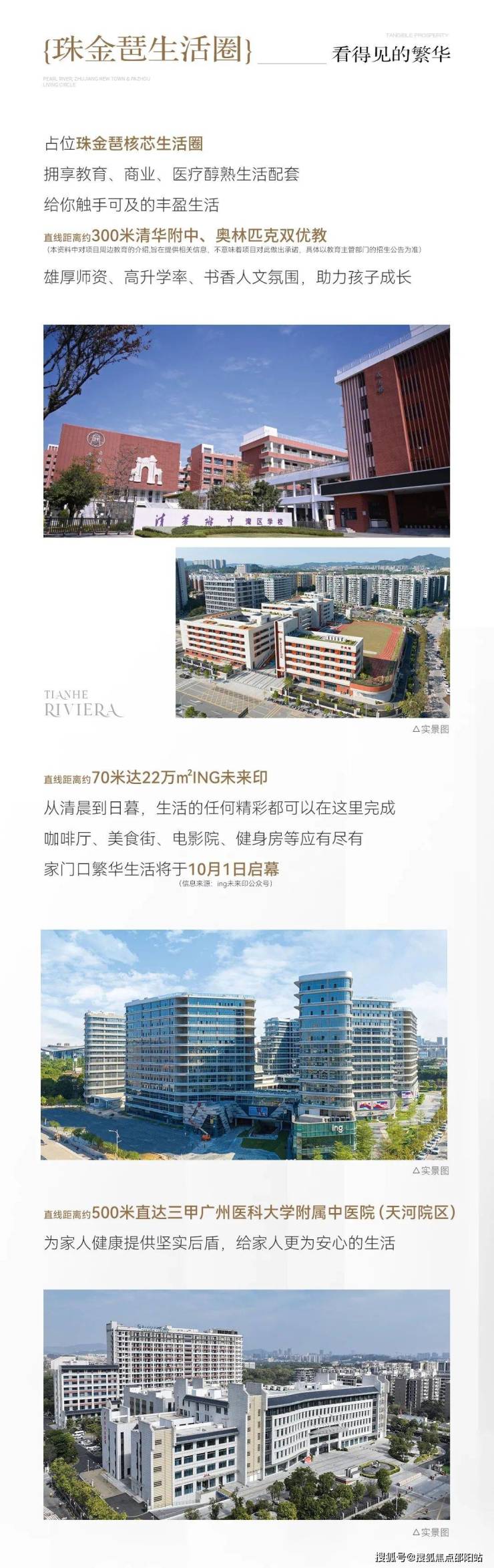 周边配套:项目对面是建面22万方的ING未来印商业综合体,预计引入盒马鲜生等知名商家。教育方面,自身配建幼儿园,广州奥林匹克中学智谷校区在小区对面,距离公立清华附中湾区学校约300米。医疗方面,周边有广州医科大学附属中医医院天河院区等多家甲级医院。
