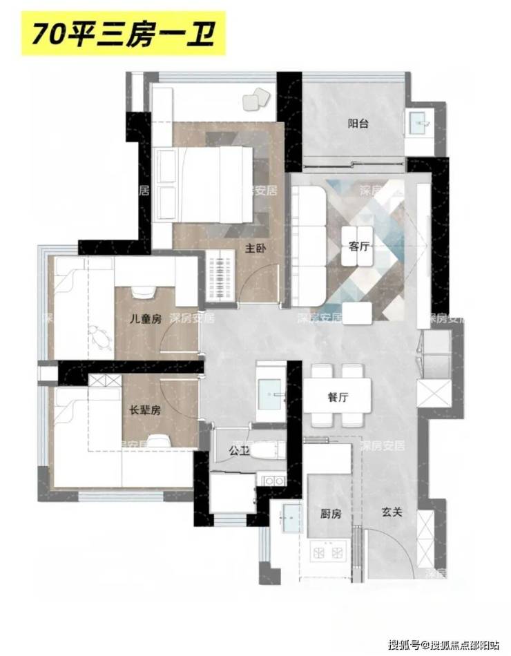 约69㎡ 3房1卫:刚需极致上车,同片区少见小面积三房;LDKB一体化、U型厨房;得房率预计接近100%(含赠送/飘窗);适合单身/小家庭;附户型示意图
