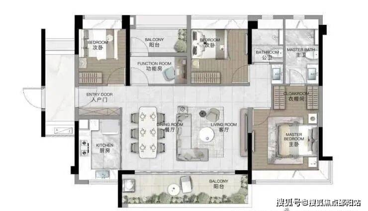 建面约143平3+1房,这个户型设计在市场上相对比较少见,进门左边就是一个次卧+公卫可以用作老人房,连接次卧的大阳台约7.9米,厨房旁边还有个小生活阳台。
