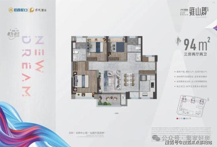 94㎡的3房2厅2卫设计的是横厅格局,进门独立玄关,客餐厅一体化,U型厨房,公卫三段式分离,得房率:70.9%(不含赠送),阳台朝西南或东南向。