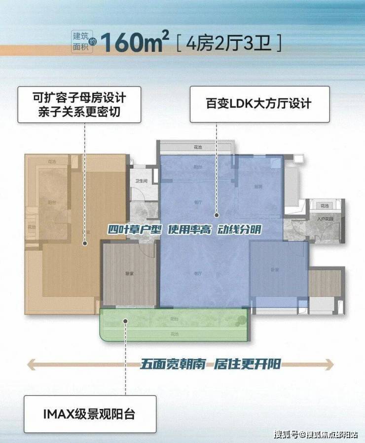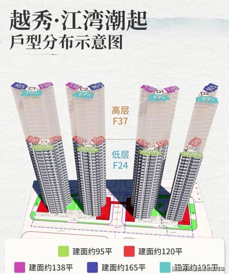 项目共规划4栋住宅楼,均为37层,分高低区设计,而且梯户比跟户型都各不相同: