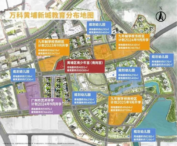 社区内配建九年制广铁一中铁铮学校,一共三个校区,西校区已经开学。黄埔区少年宫(南岗宫)已正式入驻项目,目前广州市属唯一一所艺术高中——广州市艺术中学已签约并动工,未来项目将打造全广州具备强竞争力的优质教育集群。