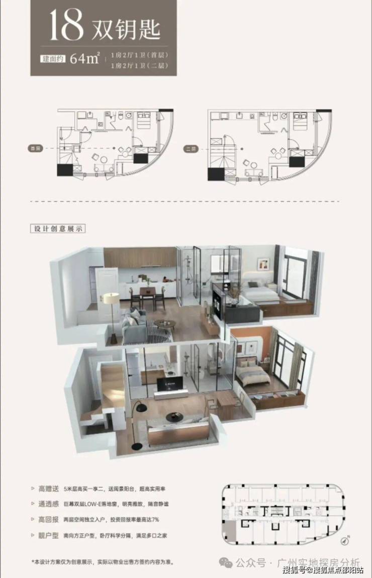 公寓:6-9层高,5米层高46-85㎡loft公寓,南向独立阳台,通燃气可明火。