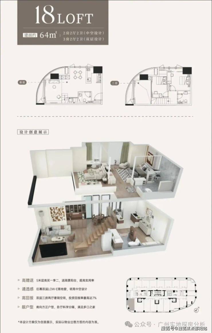 约64㎡,可设计为2+1房2厅2卫(中空设计3+1房2厅2卫(双层设计)。