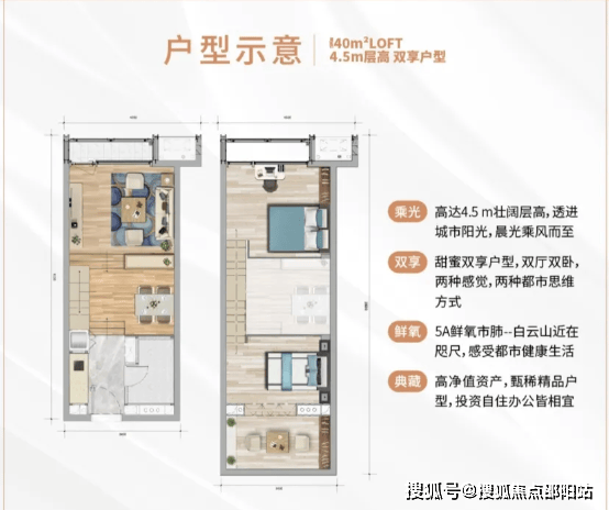在产品设计上,广垦天河1号区别于传统单一公寓模式,推出31-57㎡灵活户型,层高涵盖3.4米、3.6米与4.5米,为业主创造了多维度的空间可能。尤其是4.5米挑高复式户型,可实现上下分层的多功能布局,既可自住,也具备办公与投资属性,充分满足新一代都市人群的多元化需求。