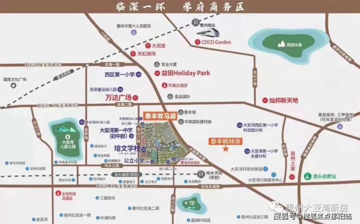 泰丰牧马湖位于惠州大亚湾大亚湾大道旁(万达广场350米)项目总占地面积约55.6万㎡,住宅总建筑面积约101万㎡,项目围绕原生湖泊而建,产品线丰富,涵盖别墅、小高层、超高层等多种产品形态,以打造“未来活居所”为理念,将规划建设成一个“开放型混合功能的全龄型社区。”
