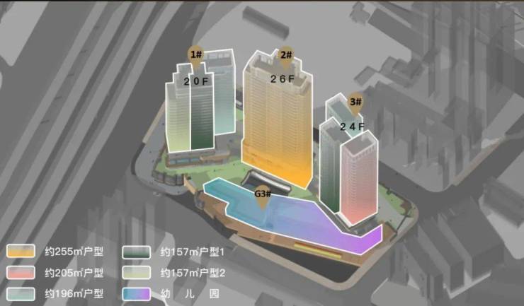 高层住宅楼以优雅的C字形向南舒展,T3栋巧妙位于地块两侧,而T2栋型的建筑面积约255㎡的楼王则位于中心,构筑成一个引人注目的建筑集群,呈现出鲜明的天际线轮廓。项目采用内向型“都市谧境”理念,整体抬高约20米,将空中花园、地面景观、会所大堂,垂直立体折叠。