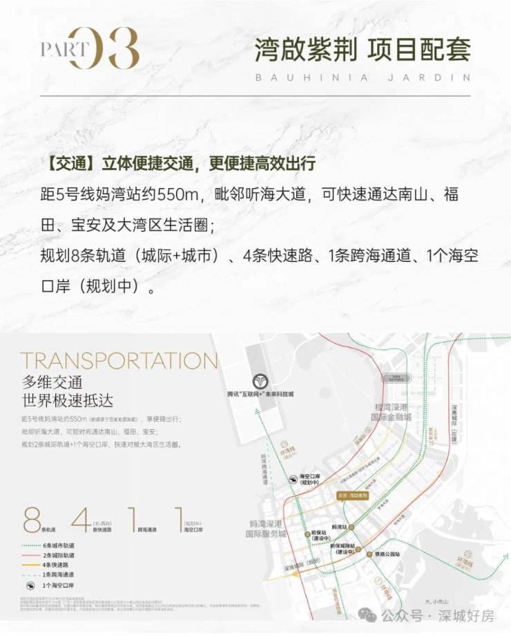 项目距离5号线妈湾站步行约550米,乘坐地铁1站可在铁路公园站换乘15号线、在前海湾枢纽换乘1号、11号线。
