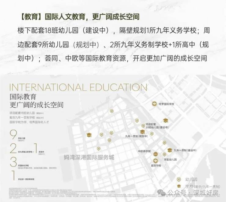 项目自身配建有一所18班幼儿园,南侧紧邻一所36班九年制学校,东侧是哈罗国际学校。