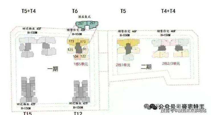 首推一期1栋5单元(45层),91-173㎡3-4房,共232套,以122-175平米4房为主,占比83%,还有两套257平顶复产品。173/257平大户型双电梯独立电梯厅入户,南区91-125平户型3梯4户。