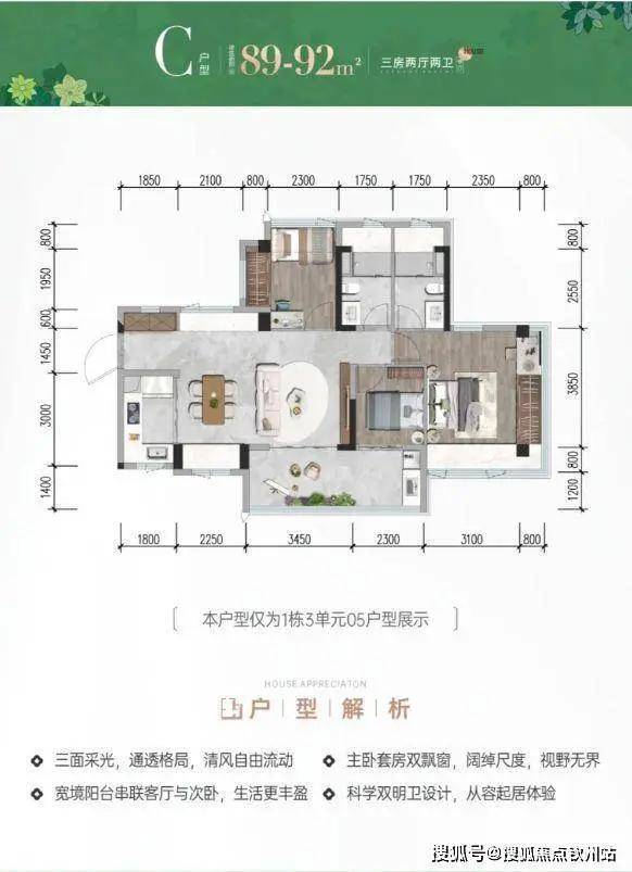 建面约91㎡3房2厅2卫(01/02、06/07户型)