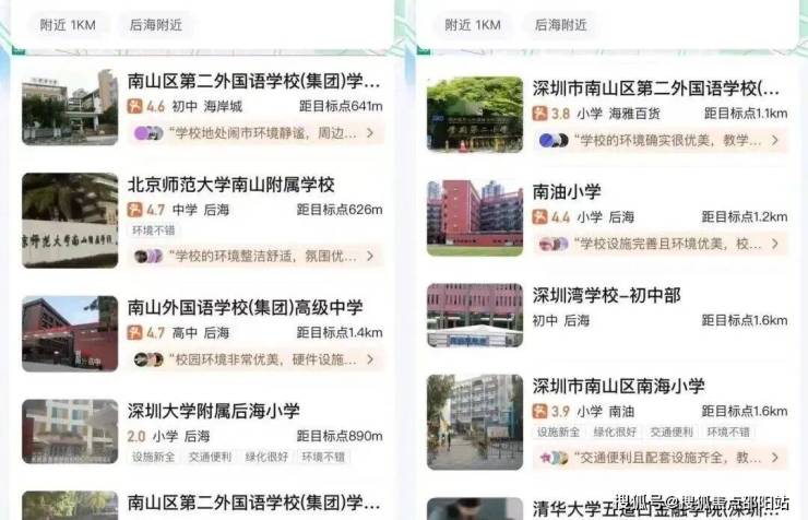 项目周边有北师大附小,南山外国语学府学校,南二外学府中心南油小学,深圳大学附属后海学校,北师范大学附中,深圳湾学校等