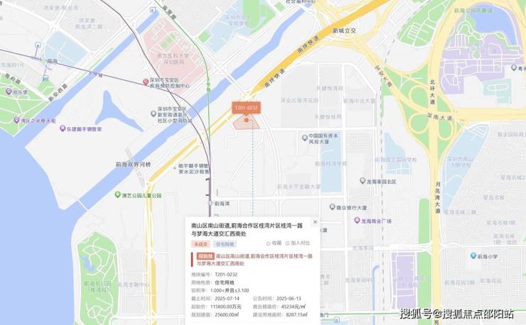 公告显示,T201-0232宅地位于前海合作区南山街道枢纽一街北侧,土地用途二类居住用地,土地面积8287.15平方米,建筑面积25600平方米,挂牌起始价115800万元,土地使用年限70年。本公告出让宗地须自《出让合同》签订之日起1年内开工,4年内竣工。